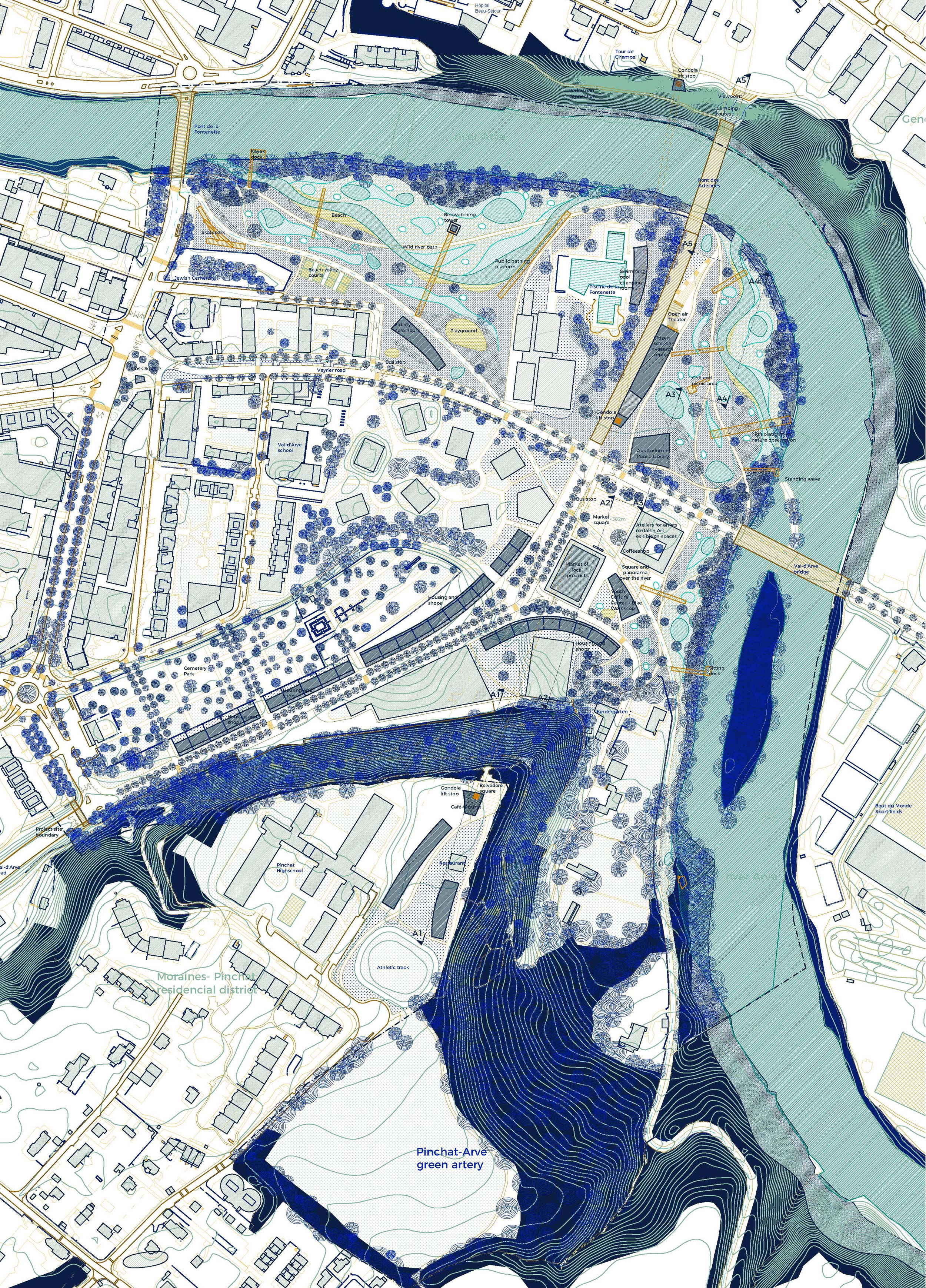 Located along the Arve River in a Key Biodiversity Area, Carouge offers an exceptional setting where nature and city intertwine. The proposal restores ecological vitality, reconnects urban barriers, and creates a shared landscape between people and wildlife with a focus on: